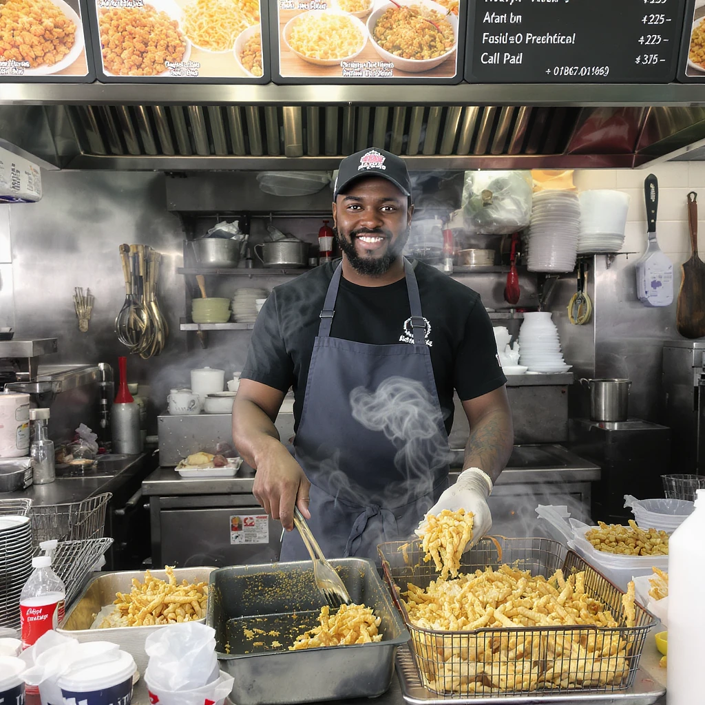 full-body image of an African American male fry cook at a fish takeout restraunt.