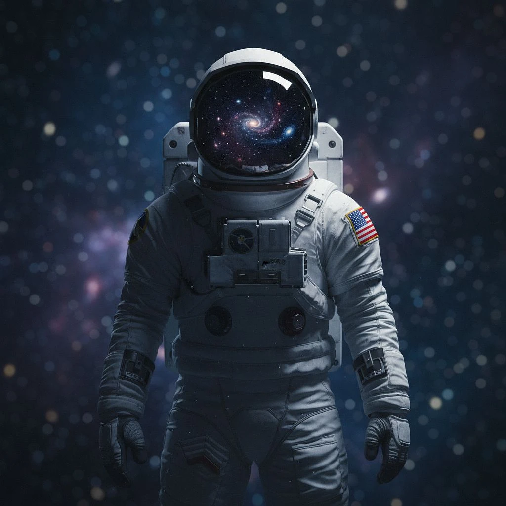 "A cinematic portrait of an astronaut in center frame. Deep space visible in helmet reflection. Shadows, lit by dim light from above. Shallow depth of field. "