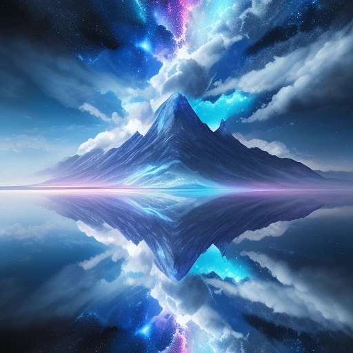 Beautiful prismatic-plasma lake blue crystal, mounteins epic, digital painting, extreme detail, 4k, ultra hd, hyper detailed, colorful, sparkle covered sky, masterpiece 3D science fiction art. Bright blue skys, clouds brigth white. sun white brigth. day