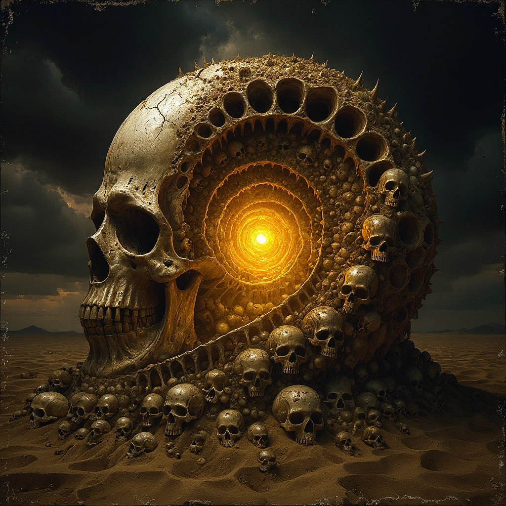 A massive, surreal skull spiral made entirely of human skulls and bones, forming a nautilus shell shape with intricate bone textures, glowing golden center emitting radiant light, set on a barren desert under a moody, cloudy sky. Add an overlay of heavy grunge texture, with worn edges, subtle scratches, and gritty details for a dark, haunting atmosphere. Highly detailed, hyperrealistic, dramatic lighting, art by Zdislav Beksinski and HR Giger, cinematic composition.