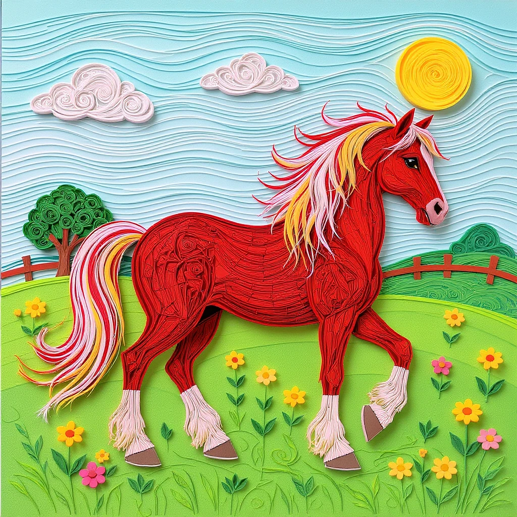 Image of an Arabian stallion in a pasture done in colorful paper quilling