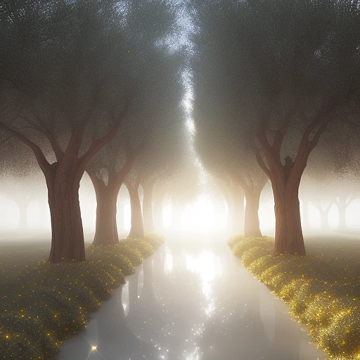 a shining fog, finely bright background, a bright daylight background, tiny dust that radiates light, in Fantastic foest, A large olive tree that glows on its own and glows every leaf, sparkling floor, a strong light