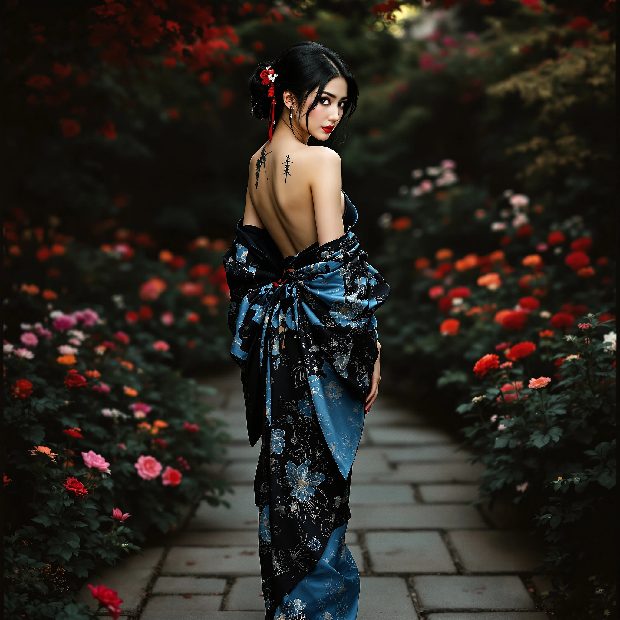 Full-length view. A beautiful and stunning Asian woman in a very short blue and black kimono, partially escaping her bare shoulders and back, with a small rose tattoo on one shoulder, turns her head to look back over her shoulder. Her long black hair, with flowers in it, is pulled back in an elegant bun, and her expression is both serene and seductive. She stands barefoot (((shows foot) )), one foot on a stone floor, in a garden filled with colorful flowers. Soft, warm lighting from a single source overhead casts delicate shadows, enhancing the intimate, ethereal atmosphere. The scene is framed by a subtle film grain and a rich, deep red and black color palette, reminiscent of the styles of Franz Marc and Max Ernst.