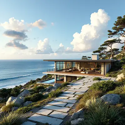 Hyper realistic eye level exterior photo of a mid century modern style house overlooking the ocean, daylight, indirect lighting, AD magazine, Frank Lloyd, Eames, Mies van der Rohe