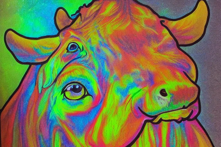 ascend portrait of cow, in the style of rick sternbach and mark tedin and alphonse mucha, trending on artstation, soft lights product view crayon art, doge, dark academia, illustrator, impasto