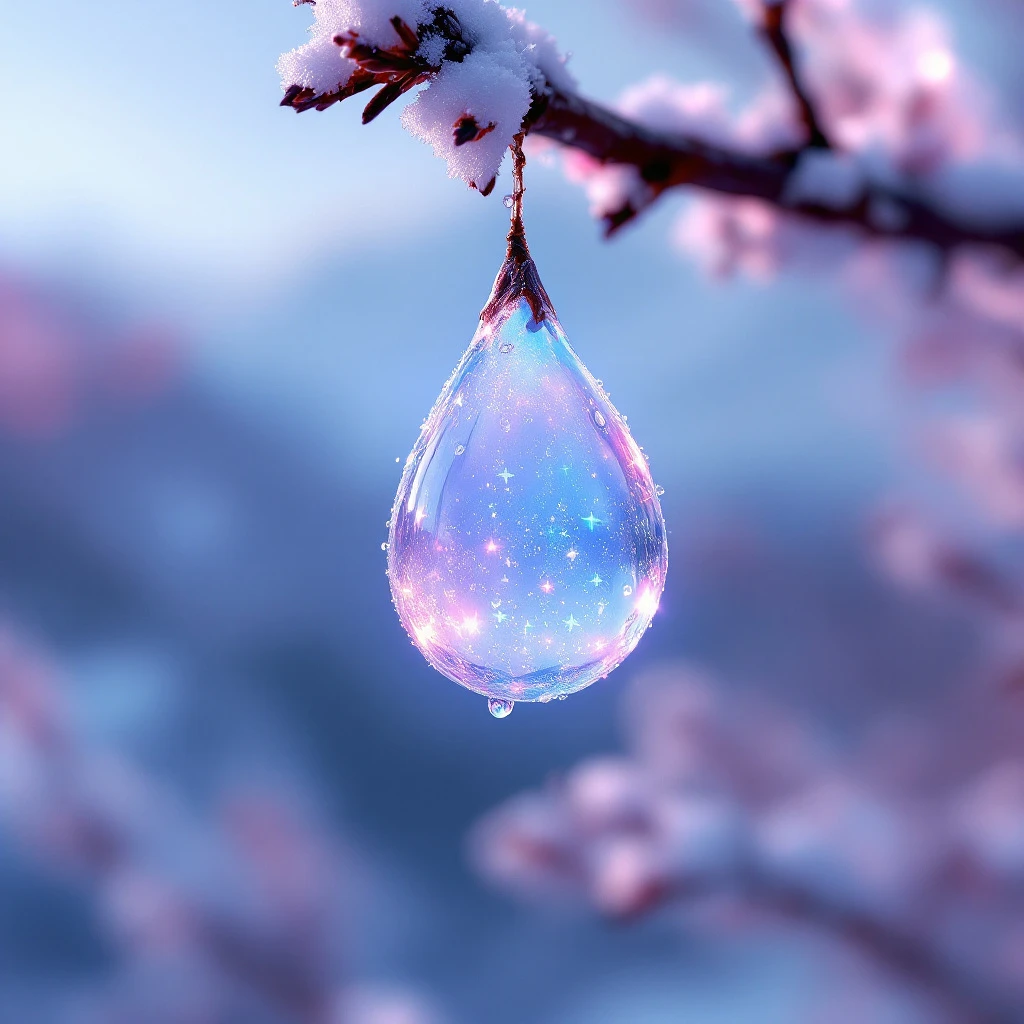 A delicate opal water drop hanging from a branch in the early morning light, decorated with glittering dewdrops. In the background beautiful snowy mountains, divine iridescent glow, the sea reflected in it dripping opalescent textures, volumetric light, ethereal, sparkling, light in the body, bioluminescence, studio photo, very detailed, sharp focus, photorealism, photorealism, 8k, the best quality, ultra Detail: 1. 2, Hype Detail, HDR, Hyperdetail, ((Universe of Stars in Drops) )