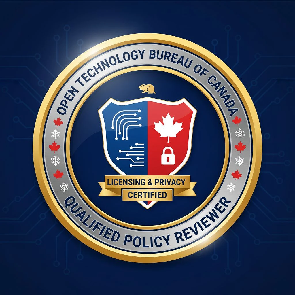 Create a professional badge that signifies a qualification from the Open Technology Bureau of Canada, that demonstrates a qualification to review licensing and privacy policies. Make sure Canadian symbolism is included. Don't use the added image.