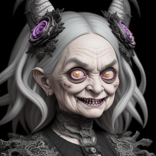Very old madness grandma with evil smile, mad sky hallucination by Mundford, baroque maximalist, chibi by Artificial Nightmares, Stanley Artgerm, Tim Burton, detailed face features, sharp eyes, extremely detailed, photorealistic, highly detailed, organic, dynamic, ultra realistic, high definition, intricate details, crisp quality, perfect composition, beautiful detailed intricate insanely detailed octane render trending on artstation, 8 k artistic photography, photorealistic concept art, soft natural volumetric cinematic perfect light, chiaroscuro, award - winning photograph, masterpiece, oil on canvas, raphael, caravaggio, greg rutkowski, beeple, beksinski, giger
