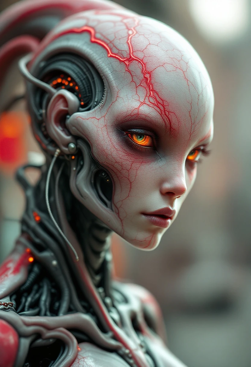 alien cyborg , blurred in a magical tilt-shift effect in the style of balanced symmetry, light red and pink, detailed facial features, manticore, organic forms, muted tones, meticulous portraiture, complex patterns --ar 2:3 --stylize 750 --v 7