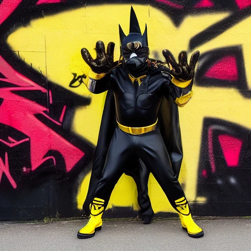 A black man in a black bat suit with yellow stripes metallic superhero suit with gold gloves and yellow boots, black sunglasses with a red backwards baseball cap with bat ears and holding two spraycans in front of a black wall with graffiti with the word ZOZ