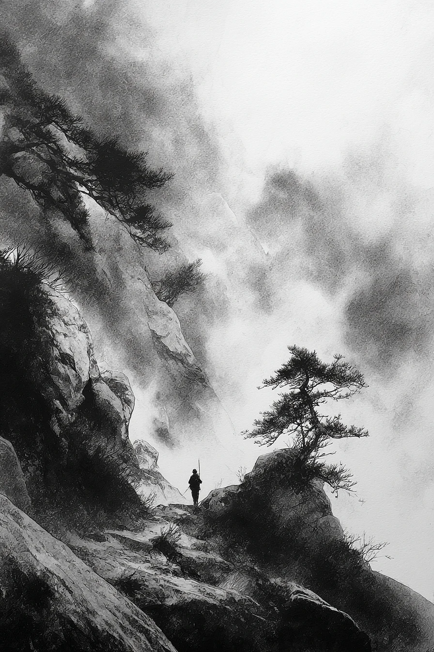 traveler, depicted in traditional japanese sumi-e illustrating crossing a misty mountain pass, intricate line work, dynamic composition, monochromatic tones --ar 2:3 --v 7