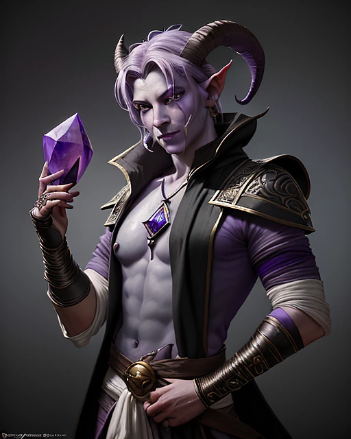 portrait painting of male magical tiefling rogue thief with lavender skintone and ram horns on the forehead and holding a gemstone in his hands, ultra realistic, concept art, intricate details, eerie, highly detailed, photorealistic, octane render, 8 k, unreal engine. art by artgerm and greg rutkowski and charlie bowater and magali villeneuve and alphonse mucha