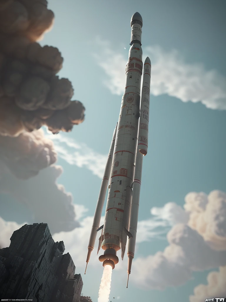Photo of a ultra realistic missile on rote, bright light, cinematic lighting, battered, low angle, trending on artstation, 8k ultra HD, hyper realistic, focused, extreme details, unreal engine 5, cinematic, masterpiece, art by studio ghibli, intricate artwork by john william turner