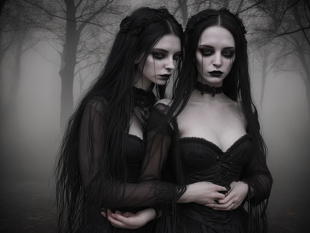 a hauntingly beautiful portrait of two women, clad in Gothic attire, poised in a mysterious and intimate embrace. The atmosphere is one of dark allure and mystique, as if the very essence of the night has been distilled into this singular moment. The women themselves are visions of pale, ethereal beauty, with dark hair that cascades down their backs like waterfalls of night. Their skin is a porcelain-like pale, adding to the overall sense of mystique and otherworldliness. Their attire is a masterful blend of Gothic elegance and mystery, featuring black dresses with intricate designs and patterns that seem to shimmer and shine in the dim light. The dress on the left features a sweetheart neckline, adorned with delicate lace trim and tiny silver sequins that seem to dance across the fabric. The dress on the right is a more structured design, with a high neckline and long sleeves that seem to be adorned with intricate, Gothic-inspired patterns. Both dresses seem to be made of a rich, velvety material that adds to the overall sense of luxury and mystery. The women's eyes are a striking feature, glowing with an otherworldly red light that seems to pierce through the darkness. Their faces are pale and heart-shaped, with high cheekbones and full, luscious lips that seem to pout with a hint of mystery. The background of the image is a deep, foreboding black, adding to the overall sense of drama and mystery. The blackness seems to stretch on forever, creating a sense of depth and dimensionality that draws the viewer in. The overall effect is one of haunting beauty and mystique, as if the viewer has stumbled into a dark and mysterious realm hidden from the outside world.