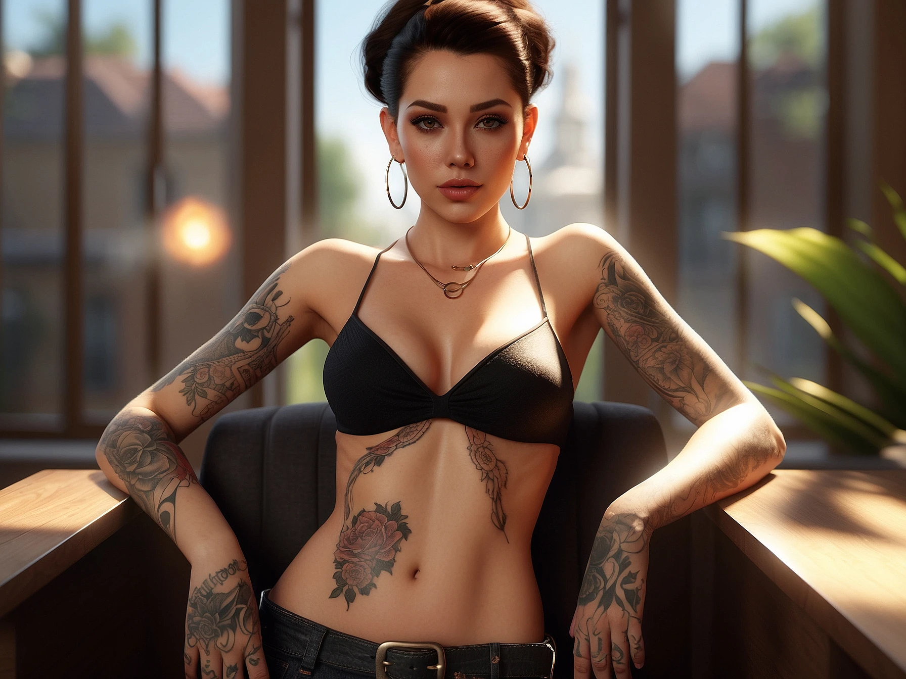 a woman with tattoos sitting in a chair, computer graphics by Frederik Vermehren, featured on cgsociety, photorealism, rendered in unreal engine, unreal engine 5, unreal engine
