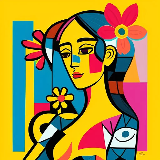 commercial illustration of a woman dressed in flowers with flowers in her hair, in the style of cubism, vibrant palette knife, pablo picasso, captures the essence of nature, sun-kissed palettes, illustration --ar 58:77 --s 750 --style raw