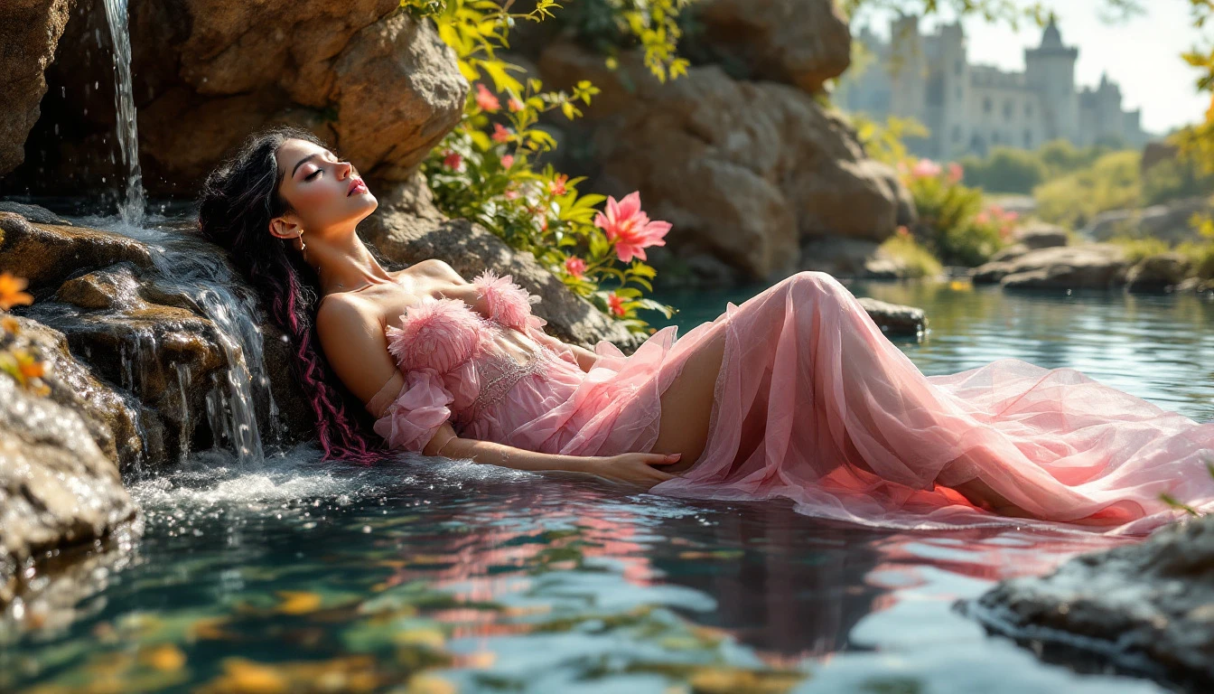 A beautiful realistic portrait of a gorgeous English female reclining gracefully, half-submerged in a tranquil rock pool. She has long, braided raven black and pink mixed hair. She wears an elegant, sheer pink gown that shimmers in the sunlight, its delicate fabric clinging to her form and flowing into the water, and barefoot. A small waterfall cascades gently into the pool. Surrounding her are beautiful plants and colorful flowers, their colours stand out against the earthy tones of the rocks. In the distance, well known midevil England unfolds—castle and an old kingdom basking in the direct light of the sun. The scene 8K, high resolution, highly detailed, and high quality.