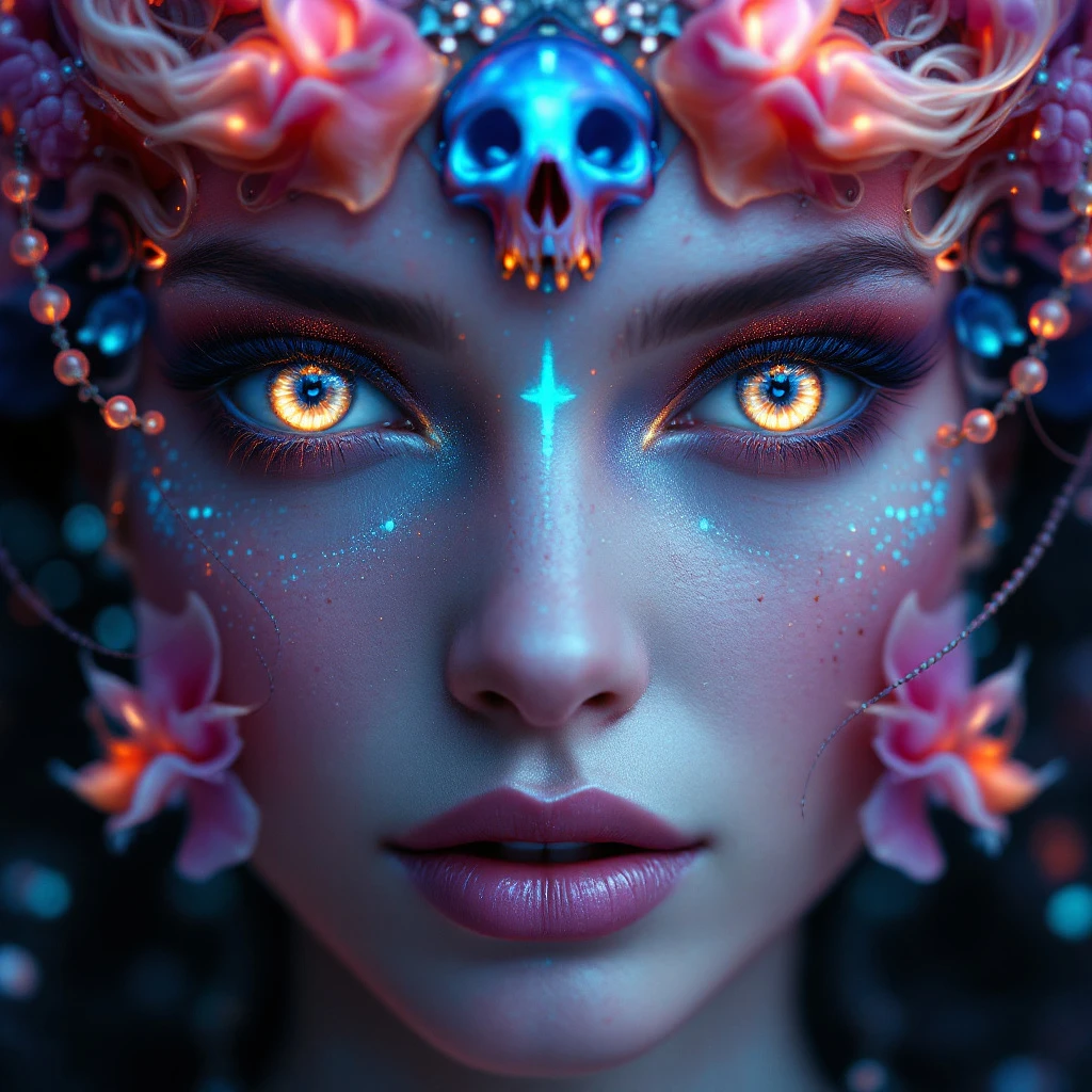 Goddess close-up portrait ribcagel. jellyfish phoenix head, nautilus, orchid, skull, betta fish, bioluminiscent creatures, intricate artwork . octane render, trending on artstation, t symmetrical artwork. cinematic, hyper realism, high detail, octane render, 8k