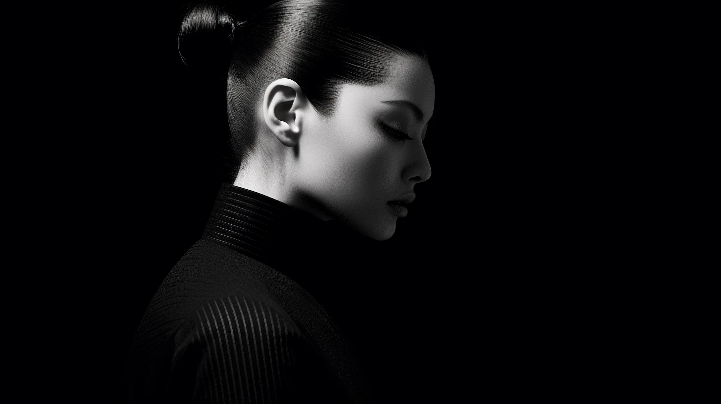 black and white photo, close up half profile shot in the darkness with very little light, black background, half face in shadow, dramatic pose, dynamic pose, delicate skin texture, in a complex glossy black fabric designed and product rendered quality thick turtleneck sweater, glossy hair, on black background, hyper detailed texture of wavy long hair, poster like, surrealism ::2, japanese minimalism ::2, nikon, hasselblad, canon, fujifilm, 8k, 16k, 32k, --ar 16:9 --s 750 --v 5. 1 --q 2