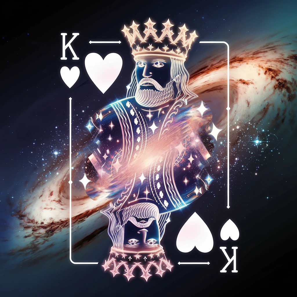 The King of Hearts card transforms into a 3D hologram that appears to be made of cosmic energy. As the King emerges, stars and galaxies swirl around him, creating a sense of traveling through the universe. The King's attire is adorned with celestial patterns, and his crown is a glowing star cluster. The hologram floats in front of you, with the background, shifting through different cosmic scenes, from nebulae to black holes. Atmosphere: Perfect for space-themed events, science fiction conventions, or futuristic tech expos.