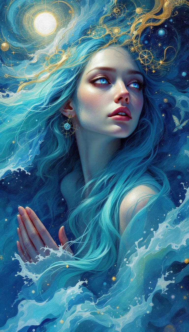 "Aquamarine Seer in a Shifting Sea of Time": A mesmerizing abstract painting portrays a seer, with a blend of wisdom and a connection to the mysteries of the deep and the flow of time. She is a skilled traveler through time and space, presented amidst a shifting and turbulent sea where the tides and currents move with chaotic energy, with a pale complexion, long, flowing aquamarine hair, and a simple, elegant robe that seems to flow with the shifting patterns of time and space. Timepieces, charts, and other tools for navigating time and space are woven into her attire and often held between her fingers. The artwork skillfully blends modern styles with a character depiction, creating a beautiful and disorienting scene using colors such as blues, greens, and silvers. Her serene, violet eyes, the composition's focal point, convey both a deep understanding and a profound sense of calm. After a long night spent traversing the currents of time, the seer embodies both a powerful intellect and an enduring and timeless spirit. The soft lighting and dynamic motion invite the viewer to explore the hidden narratives within this vibrant artwork, presented as a painting.