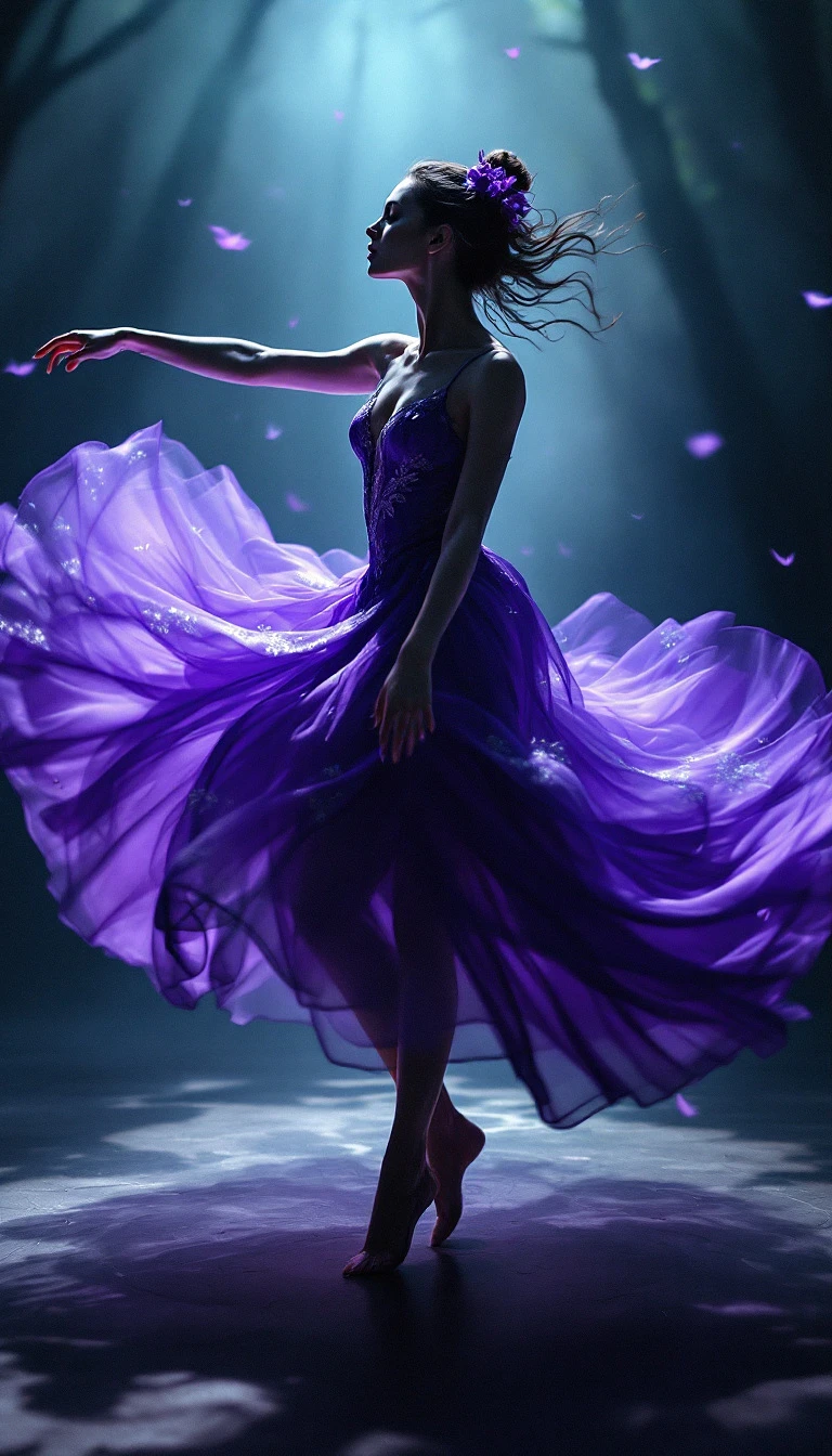 "Violet Vortex: A Dance of Mystery": A live-action film sequence captures a female dancer, framed at a 45-degree angle of the screen. She whirls with graceful speed, her vibrant violet dress with delicate silver lace, creating a vortex of movement as she performs an entrancing shadow dance. The skirt seems to pull the light in, leaving a dark, flowing trail of motion that seems to move with her every step. The lighting is moody and ethereal, enhancing the sense of mystery, and with a fantastical and imaginative backdrop.