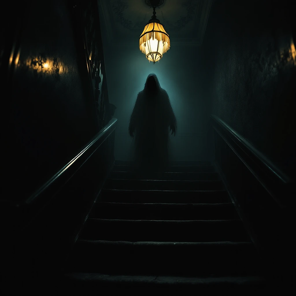 A gothic horror style image, A fuzzy very dark shadow human like form, standing on a victorian staircase, a very dark old victorian british house, the form seems to be ascending the stairs, at the top of the stairs is a single ceiling light with fringed shade, the light casts a dim amber glow down the stairs, viewed from bottom of the stairs looking up.