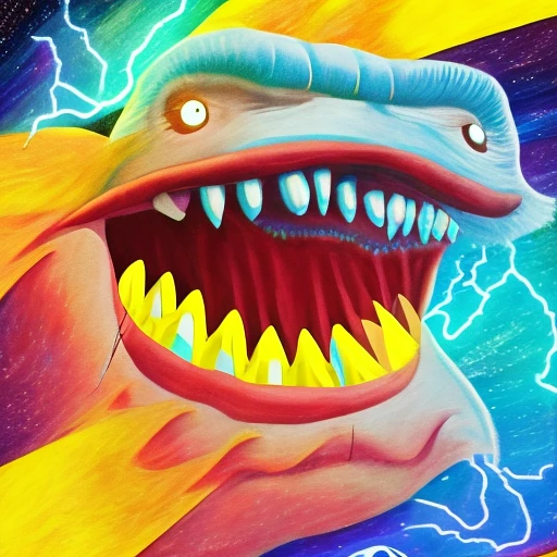 A big Mouth allone, and the Text "SUNO" under it, in the background a colorfull universe with Blue lightning coming from the mouth
