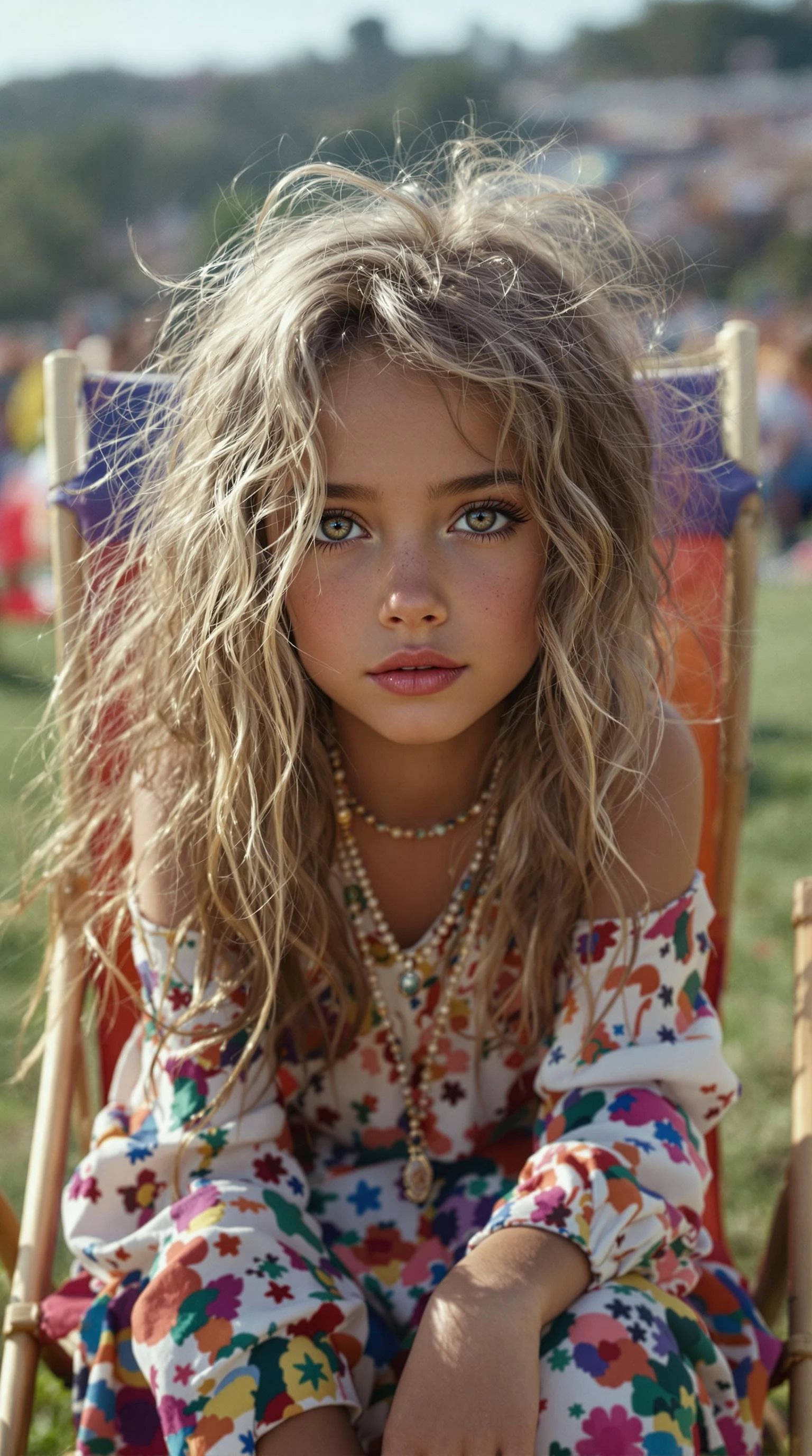 a professional photo of a exceptionally beautiful girl in the world (age 7) , (seven year old) 1969's girl highly detailed, futuristic, (futuristic) , (masterpiece) , (realistic) , (perfect anatomy) , (Full body from head to knees) , (facing the viewer) with long platinum messy curly light brown hair, beautiful olive skin, thick black eye liner, extra long eye lashes, light pink blush, extremely beautifully shaped lips with light pink lipstick, dark blue eye shadow, perfectly flawless skin, beautiful perfect high cheekbones beautiful perfect high cheekbones extremely detailed large perfectly shaped beautiful brilliant Forest Tea blue-brown-red-golden-grey-purple bedroom eyes, beautifully manicured long fingernail with red polish, dressed in a style of a hippy at Woodstock, sitting outside on a lawn chair, on a hillside with the stage behind her, 8k, (high res) , ultra-detailed, photo-realistic, full image view, full body view, front view, highly detailed, volumetric, dramatic lighting