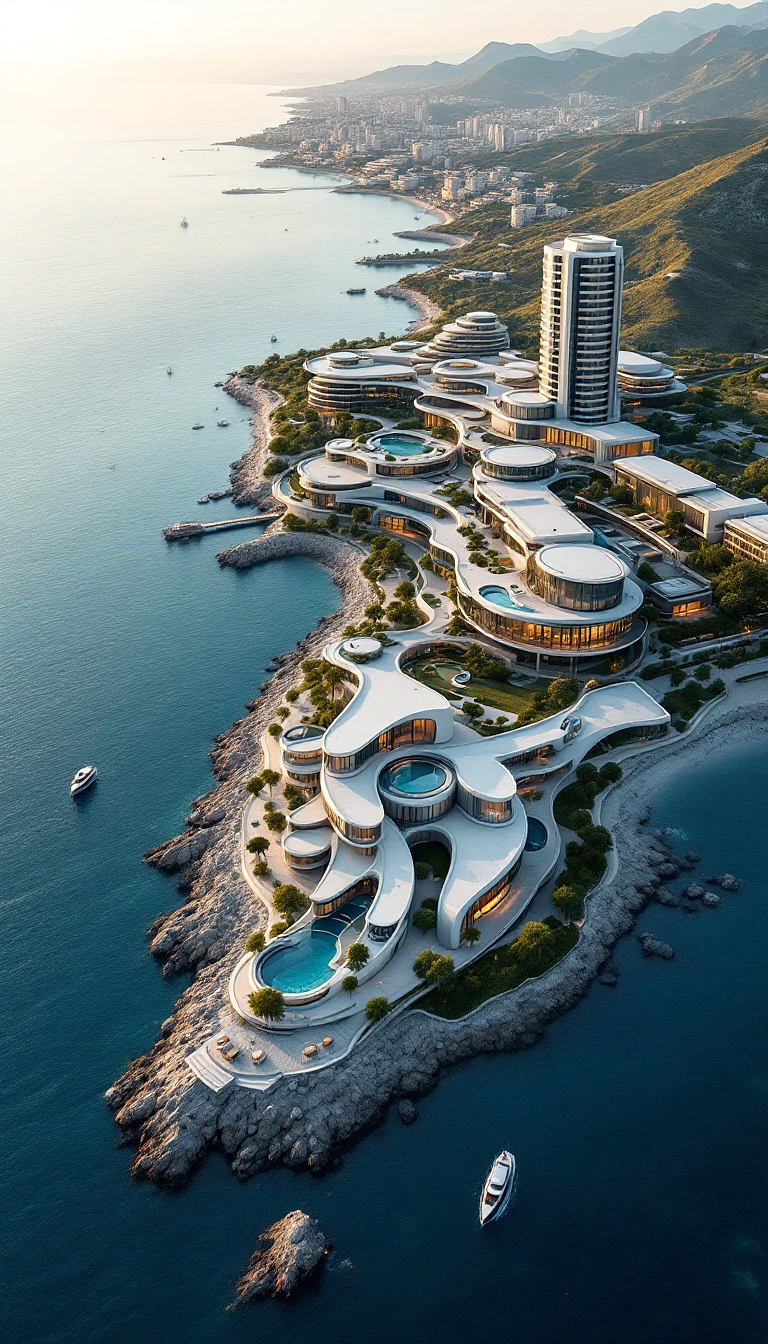 Ultra-realistic aerial cinematic view of Crimean coastline, focusing on modern luxury hotel complex. Minimalist architectural design with clean, geometric lines and flat white/gray roofs. Sleek contemporary buildings with glass facades, seamlessly integrated into coastal landscape. Pristine waterfront with architectural precision, minimal landscape intervention. Scandinavian and Japanese minimalist design influence. Sharp architectural lines, maximum transparency, neutral color palette - whites, grays, soft concrete tones. Modern infrastructure, subtle architectural bridges connecting buildings. Golden hour lighting with soft shadows, creating depth and sophistication. Hyper-detailed urban planning, 8K resolution, photorealistic architectural photography style. Emphasis on clean design, negative space, and architectural elegance. No traditional mountains, focus on smooth coastal terrain and cutting-edge architectural solutions.