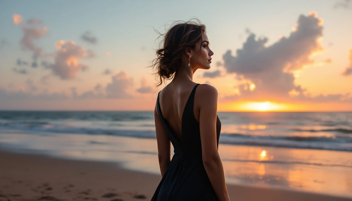 Estilo tipo inspirador. Paisaje: playa al atardecer. Una mujer empresaria (sin aretes, ni accesorios en las orejas) que lleva un vestido cerrado, de vestir y elegante con su mirada al horizonte, vista a la distancia con su cuerpo en perfil, podemos ver el perfil de su rostro a la camara, distant view, mira hacia el cielo, el sol ilumina sus rostros. Es importante que aparezca solo la silueta, distant view. No se le ve la cara.