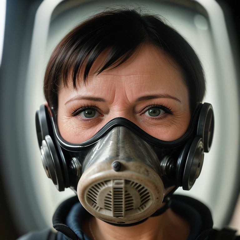 hyper realistic headshot photo of a 50 year old woman, wearing a gas mask, short hair, Extreme Close-Ups, Full Frame camera, ISO: 100, Aperture (f-stop) : f/1. 8, Shutter Speed: 1/30, Camera Lens: 85mm prime lens, Camera Eye Line: Low, Studio Lightning