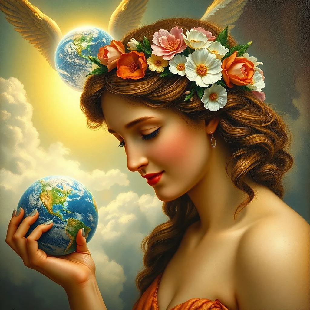 A closeup of the beautiful Venus with flowers in her hair, painted in the style of old masters. She is looking down and smiling. The background shows an angel holding up earth from which light shines on vapor clouds. --ar 77:83 --v 5. 2