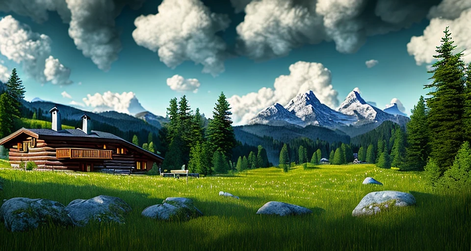 hyperrealistic photo german chalet cabin, green meadows, summer, pine trees in the foreground, high mountains, blue sky, cumulonimbus clouds cinematic, hyper realism, high detail