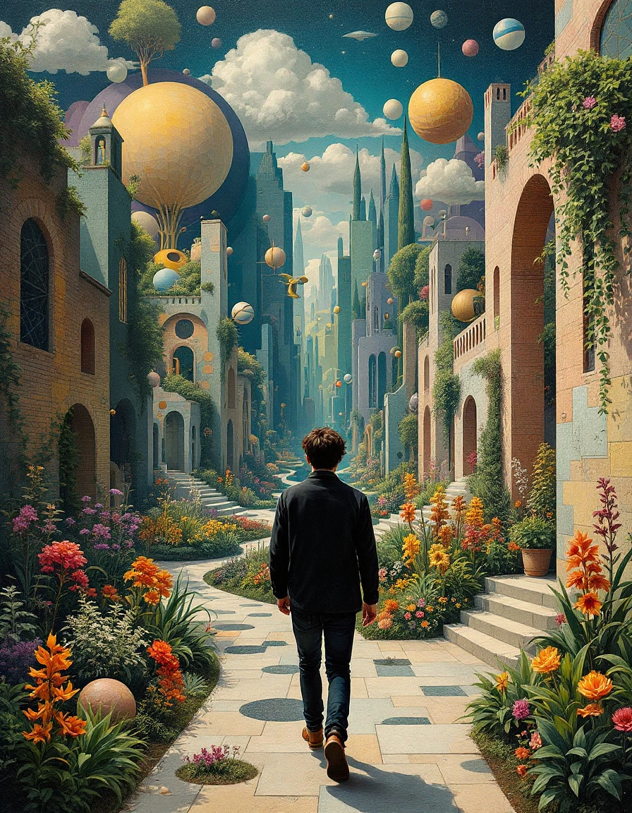 Picture a person coming toward the viewer, in a surreal garden filled with impossible geometries and dreamlike landscapes, painted in the style of Joos de Momper. The person looks at us as if they know us.