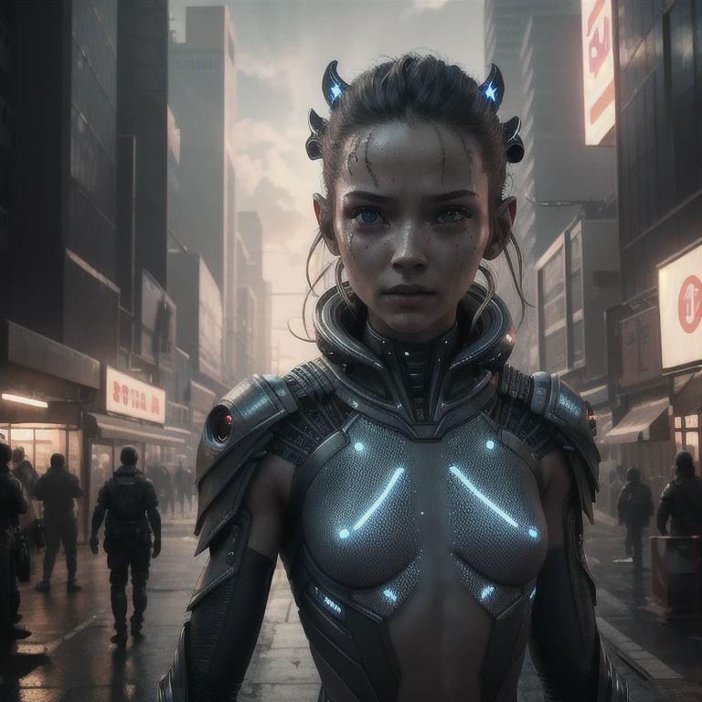 masterpiece, best quality, photorealistic, dramatic lighting, raw photo, ultra realistic details, sharp focus, detailed skin, alien space girl in a strange dystopian electric city