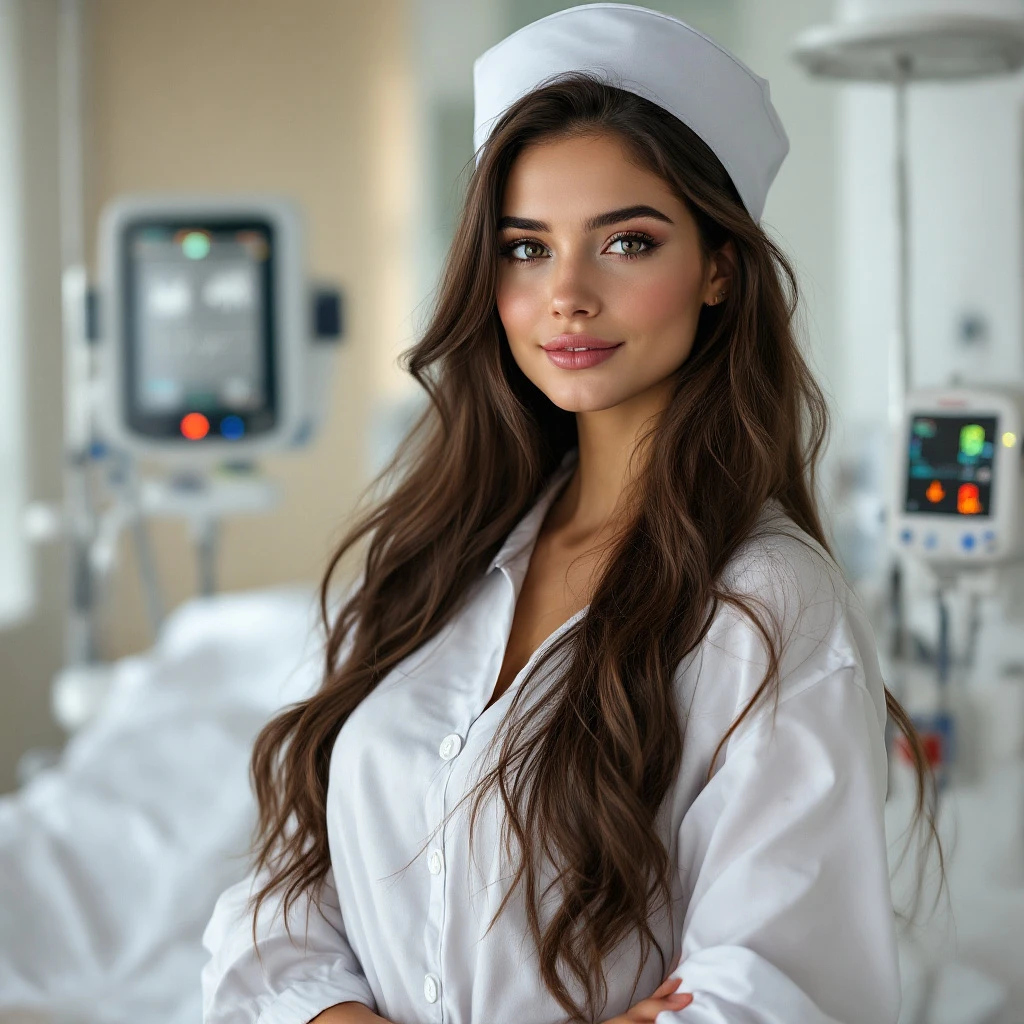 female, 1girl, a woman, a hot girl, long brown hair, nurse, hospital, standing, hospital room, white outfit, buttoned shirt, nurse hat, patient bed, heartrate monitor, one girl, one person