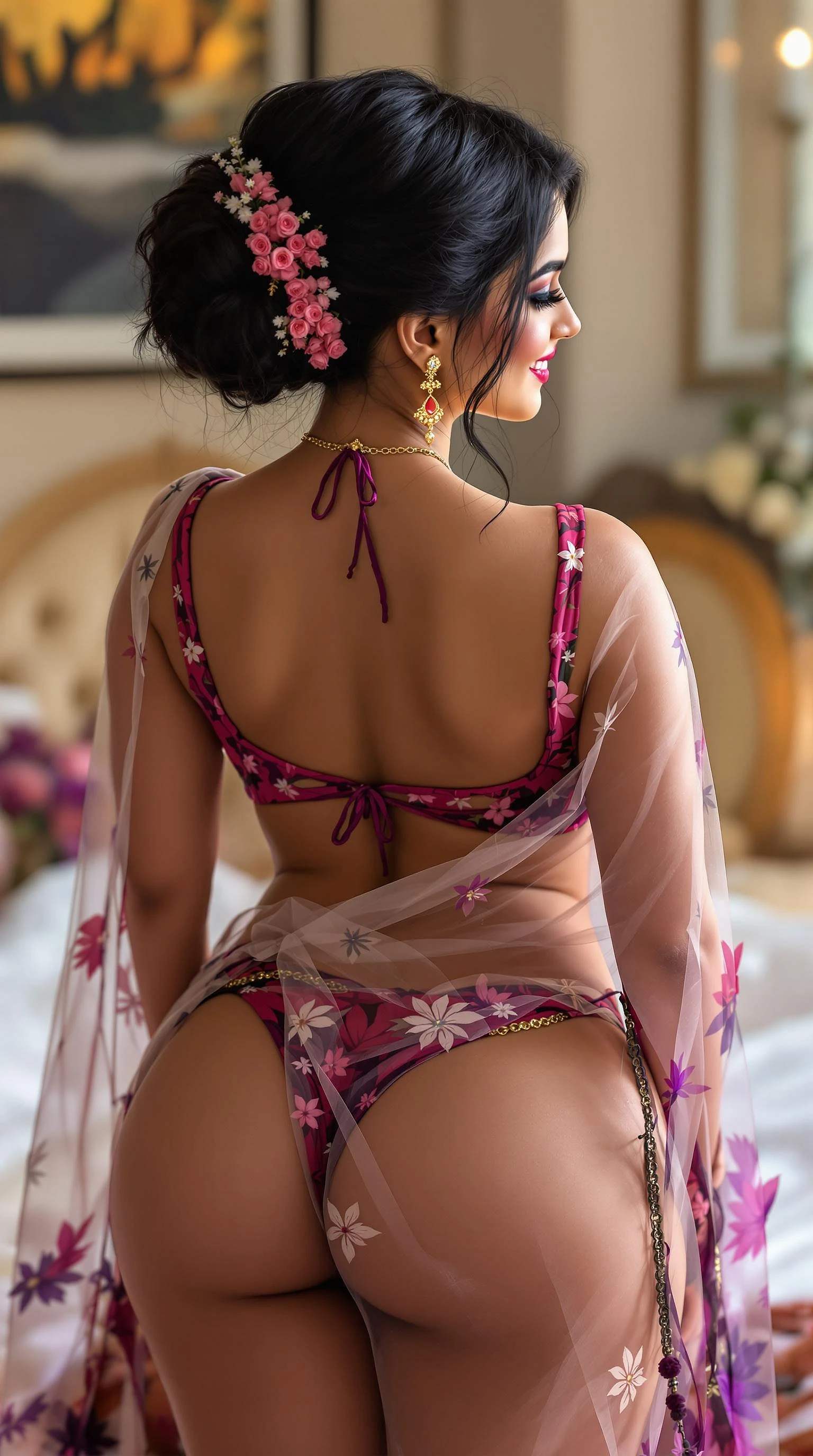 a full side front view boobs realistic looking at her back to the with sexy smiley face a slightly plus size Indian hot and sexy standing on showing her beautiful heart shape ass, showing her front cleavage boobs side up on bed spreading her thick legs showing full soft sexy legs at a beautiful mansion with transparent purple magenta black and white colorful very thin transparent scarf on boobs and ass showing front view appealing big cleavage with no bra or panty Use light and shadow see through view of her legs and ass shape, capture the delicate contours of her face and the intricate details of her classic hair style black vibrant colors to capture the intensity of the flowers, her hairs styles Gorgeous Cupcake Hued Bun-Style Bridal Hairstyle, she is laughing out loud sexy, she is looking at her back with smiles with side view of her boobs and round ass