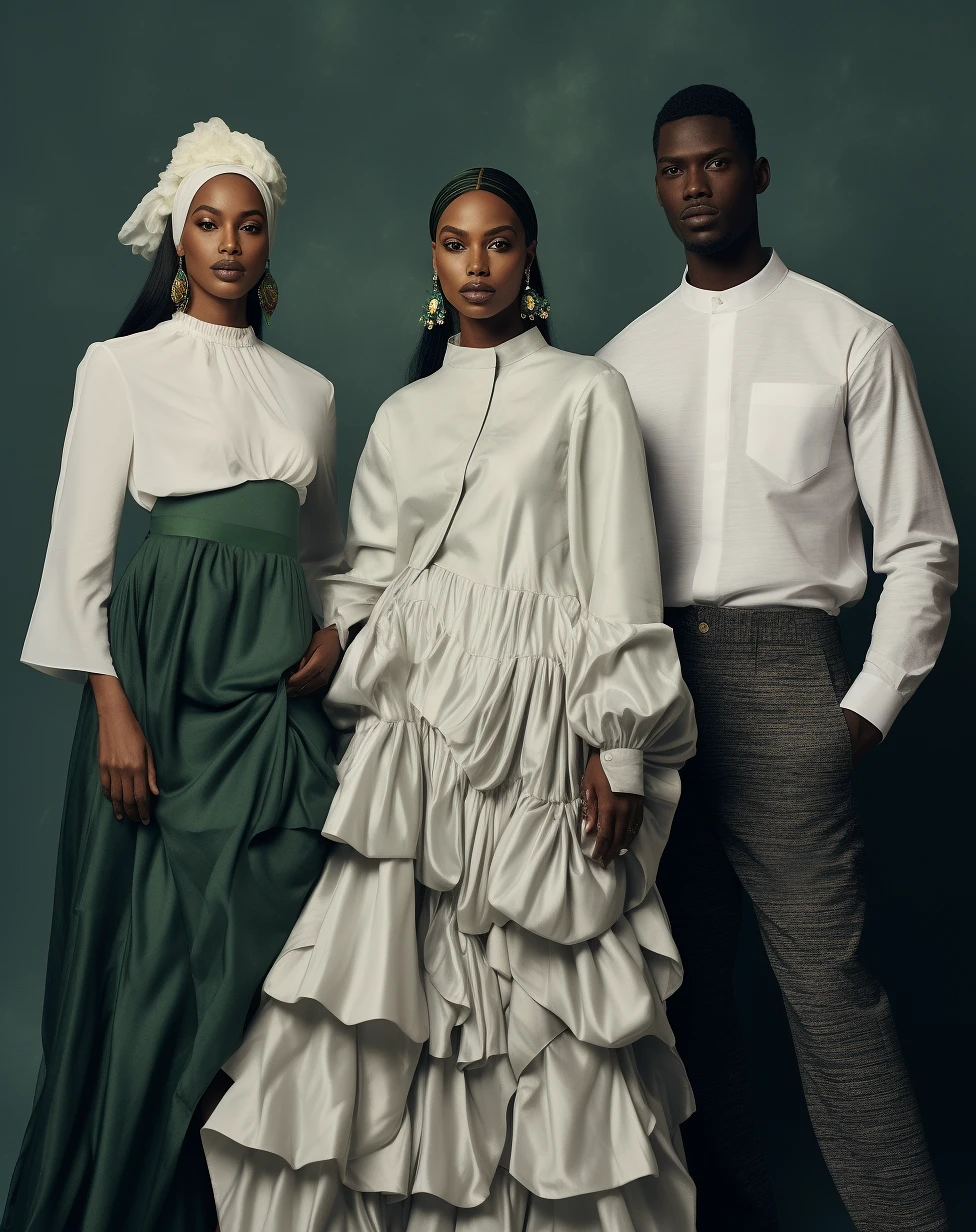 A photo of four African models wearing modern and luxurious outfits, posing for the camera in front of grey backdrop. The first model is standing upright with dark skin, long hair styled into loose waves, dressed in an elegant white shirt paired with a flowing green skirt adorned with floral patterns. She wears a hijab over her head . The second female model sits on ground leaning against to male model who stands beside them both. He has short black hair , wearing pants suit with belt, tshirt. They all pose together. --ar 101:128 --v 5. 2