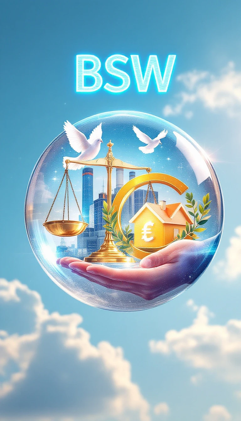 A crystal-clear glass sphere floating in front of a serene blue sky with soft, wispy white clouds. Inside the sphere, a dynamic collage of symbolic elements: a modern factory with solar panels representing industrial strength, a golden balance scale symbolizing social justice, a white dove carrying an olive branch for peace, a protective hand holding a house representing social housing, and a glowing Euro symbol merged with a shield representing economic security. The elements are arranged in a harmonious, circular flow within the sphere, connected by subtle streams of light. The letters 'BSW' appear as a semi-transparent blue hologram floating above the sphere, casting a gentle glow. The entire image has a photorealistic quality with soft depth of field, highlighting the sphere's glass texture and the interplay of light. The composition suggests hope and balance, captured in high resolution with natural lighting and subtle lens flare effects. --ar 16:9 --style raw --v 5. 2