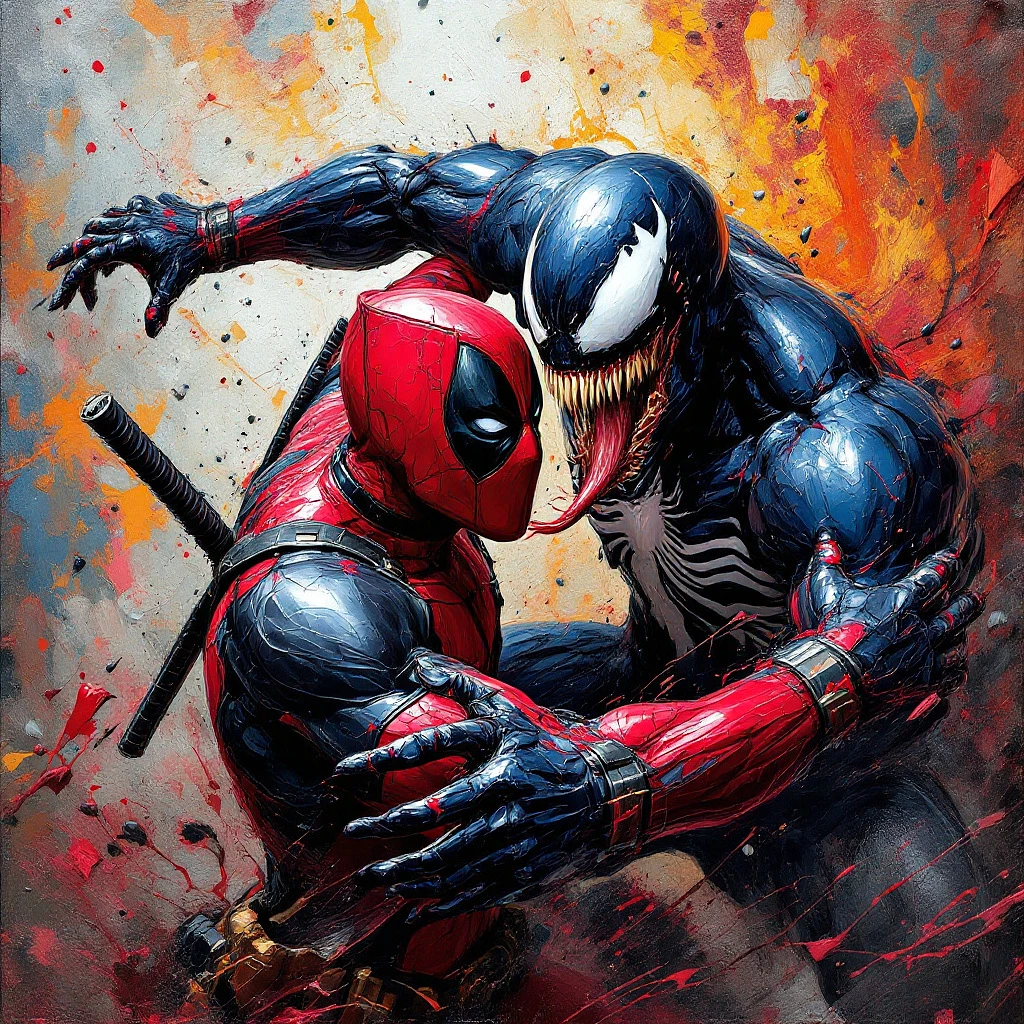 Render a hyper-detailed, dynamic oil impasto painting of Deadpool locked in combat with Venom, heavily textured paint application.