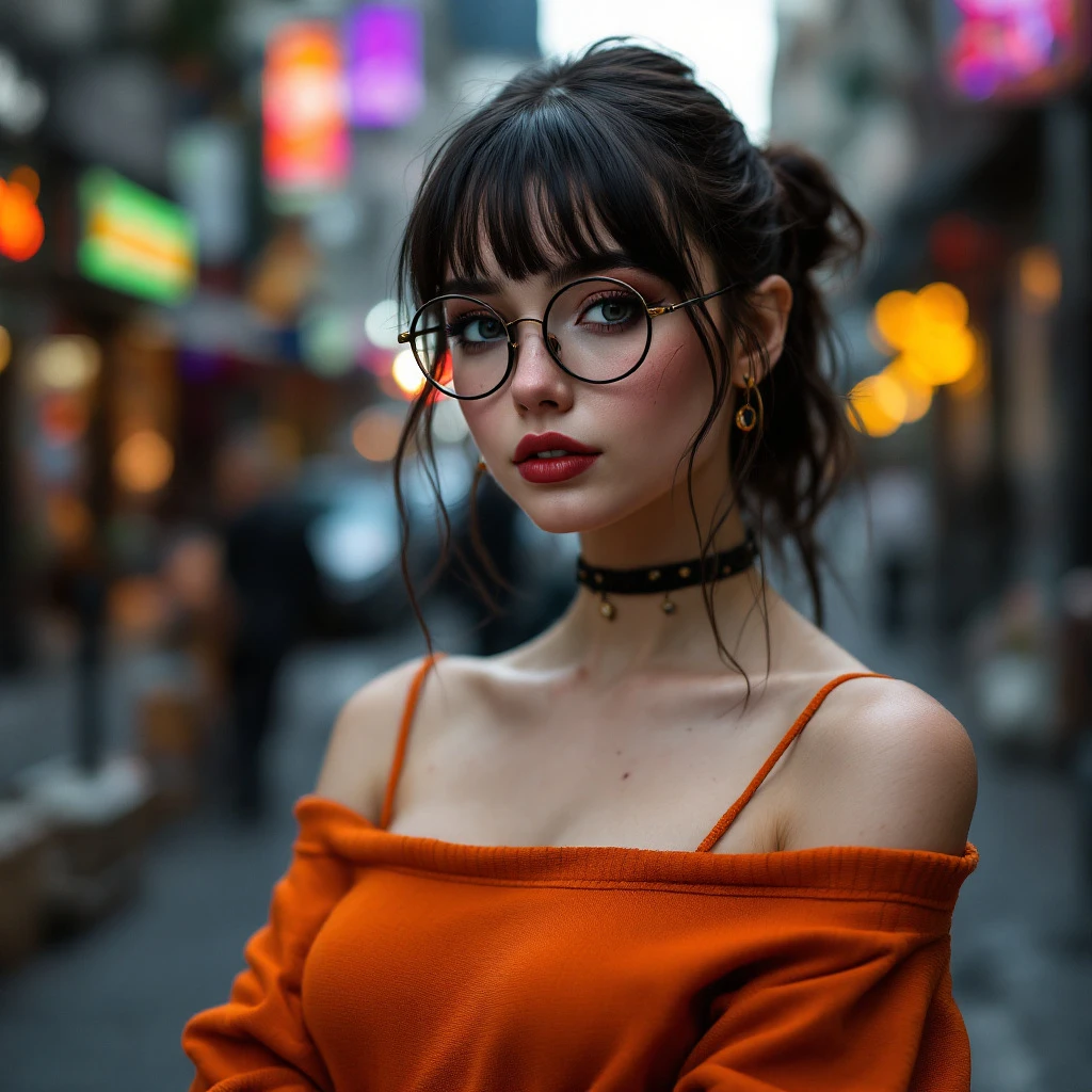professional portrait, goth girl, velma from scooby-doo, a girl wearing eye glasses and an orange top, gorgeous figure, interesting shapes, hyper realistic, ultra detailed photograph, wearing an off shoulder slim sweter, detailed gorgeous face, natural body posture, captured with a 85mm lens, bokeh, ultra detailed, ultra accurate detailed, bokeh lighting, surrealism, urban settin, ultra unreal engine, intricate, epic, freckles, goth style mood, dark eye makeup, in the style of jessica drossin, dima dmitriev, life-size figures,