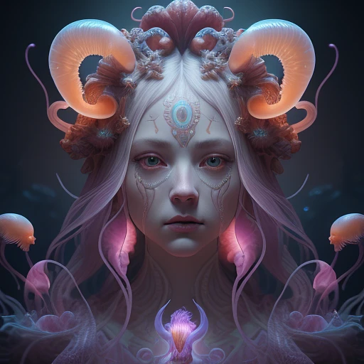 Goddess close-up portrait ribcagel. jellyfish phoenix head, nautilus, orchid, skull, betta fish, bioluminiscent creatures, intricate artwork . octane render, trending on artstation, t symmetrical artwork. cinematic, hyper realism, high detail, octane render, 8k