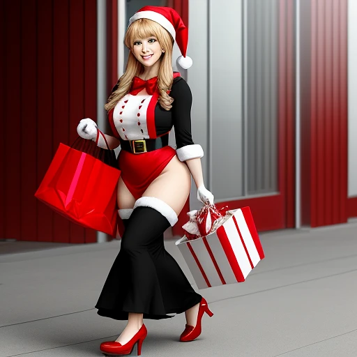 An anime beautiful Mrs. Santa Clause full body with a red, white, and black dress with red, white, woman hat and red shoes on while carrying gifts.