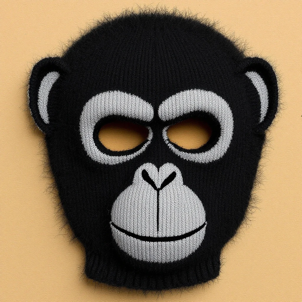 a black ribbed knit skimask, two holes for the eyes, one hole for the mouth, painted chimpface on it