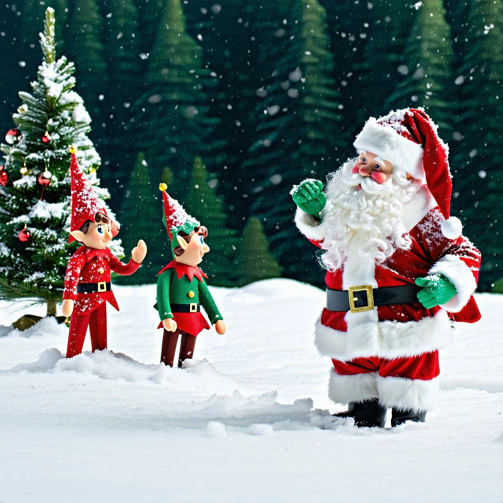 christmas card cover reflecting a pristine snow covered lanscape with santa and the elves in the back ground with christmas trees and woods in the background. Realistic, 4k