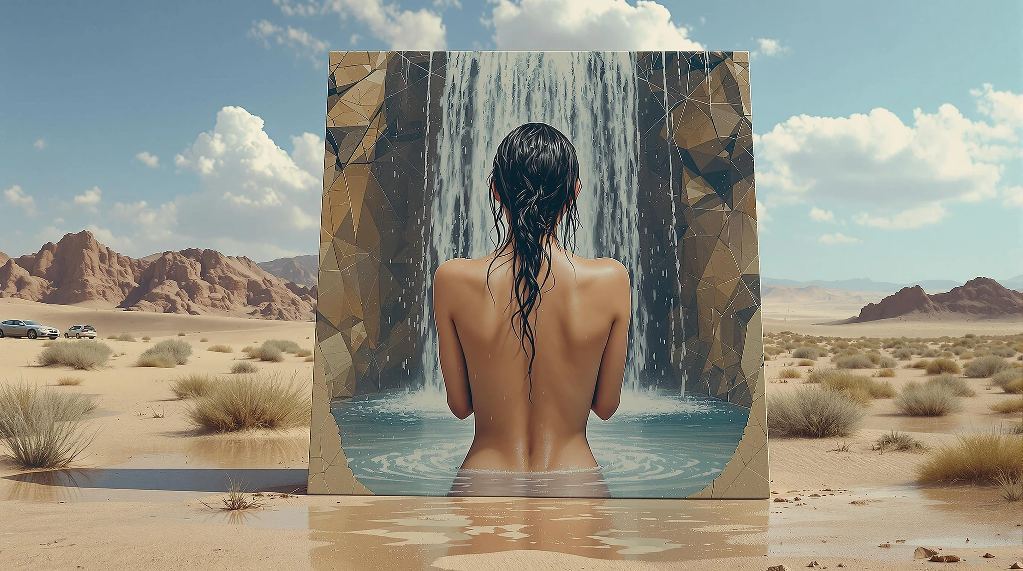 surrealism painting 3d scenery, in the middle of the desert, a giant canvas displays a stunningly realistic oil painting of a gorgeous woman taking a shower, the view is from the back, the woman's figure is two-dimensional, with visible brushstrokes and texture, washing her hair under a waterfall, the desert acts as a display for the canvas, the desert is hyper-realistic, Unreal Engine, camera view up, extreme low camera angle, dynamic angle, 8k, wet hair, wet face, bright colors, with subtle cracks and worn edges on the canvas to emphasize the painting illusion.