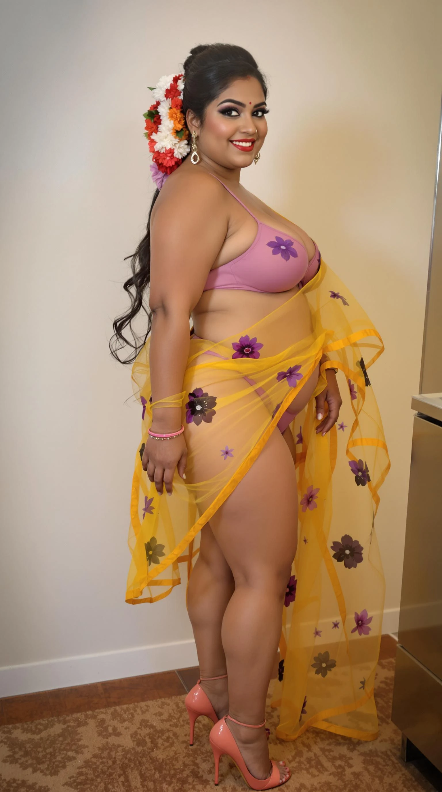 a full side front view large puffy boobs beautiful black eyes plus size legs with high heels matched color cleavage realistic looking Sexy Indian plus size sexy white Indian woman with sexy smiley face a Indian hot and sexy standing on her front cleavage she is with transparent yellow purple black red and white very thin transparent scarf on boobs see through rear of bra and tiny while panty , capture the delicate contours of her face and the intricate details of her classic hair style black vibrant colors to capture the intensity of the flowers, her hairs styles Gorgeous Cupcake Hued Bun-Style Bridal Hairstyle, she is laughing out loud sexy, she is looking at her back with smiles see through side hip view