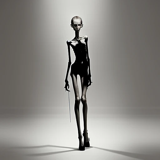 a needle-thin anorexic girl with skinny long legs and long skinny calves in high heels with long hooked claws, naked