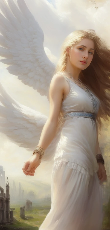 slavic pagan angel descending from the sky in front of a gigantic wooden temple,